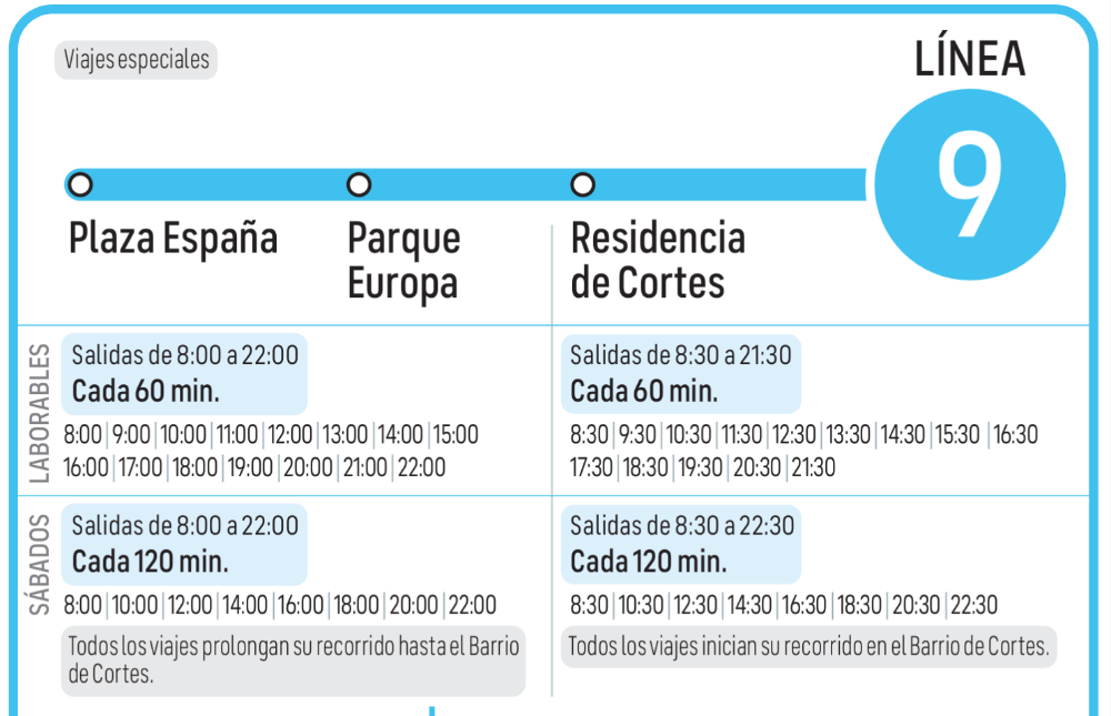 Línea 9: Plaza España - Parque Europa - Residencia Cortes Itinerario Icono Mapa Consulta el Itinerario en Directo Horario Documents LINEA_09.pdf (pdf 27,3 kB)