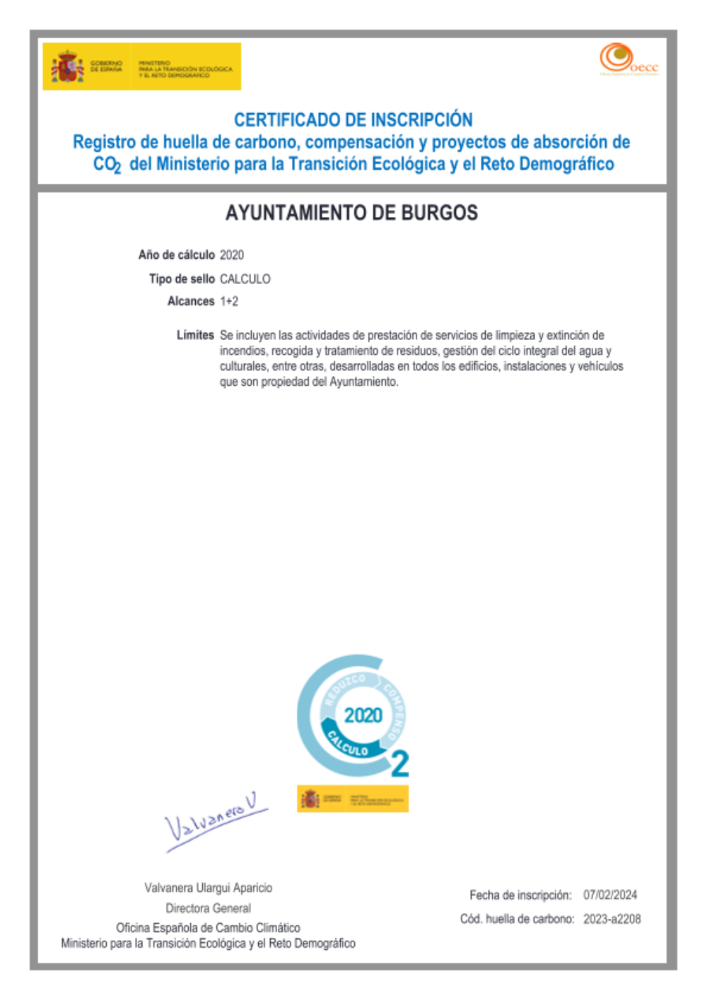 La Oficina Española de Cambio Clímatico ha inscrito al Ayuntamiento de Burgos en el Registro de Huella de Carbono, Compensación y Proyectos de Absorción de Dióxido de Carbono