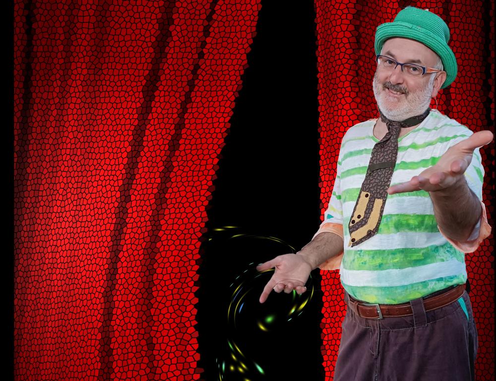 Número de ilusionismo con magia cómica y sketches clown para público familiar . Espectáculo excéntrico , desde la magia, el humor y lo inesperado. Conoce al perro Chanclas, al Señor Globo y busca las piruletas desaparecidas junto a Tritón.