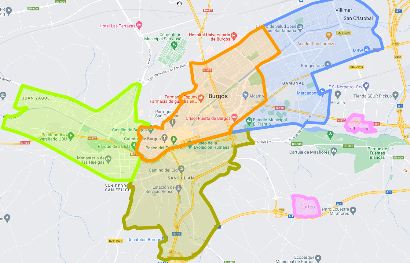 e) Distrito Periférico: conformado por los barrios de Villatoro, Villayuda - La Ventilla, Villalonquéjar, Villagonzalo Arenas, Villafría, Cótar y Cortes.